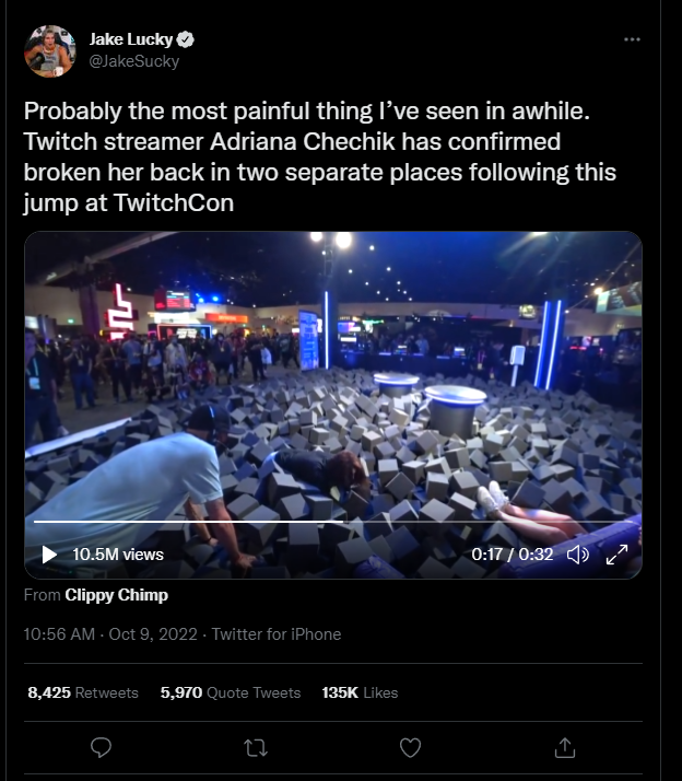 The exhibit, Lenovo Legion, and TwitchCon, found themselves under fire this past Sunday, the last day of the 3-day convention, when creator Adriana Chechik (@ChechikTv on Twitter1) announced on twitter that she broke her back in two places, requiring surgery to get a (metal) rod inserted for support, after landing on her tailbone when she jumped into the foam pit.