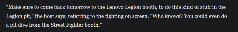 Let’s look at the hosts, Rachel “Seltzer” Quirico (@SeltzerPlease), Rivington Bisland III (@RivingtonThe3rd), and Paola Alejandra (@pancakepow). All three hosts have impressive and reputable professional esports commenting/hosting experience and are represented by a talent agency, but was it their responsibility to help “manage” the exhibit or do anything beyond hosting/commenting? Were they given any instruction on what’s expected from them beyond “Do your professional hosting thing for us on our Lenovo Legion Twitch channel and make it fun to watch,” specifically if something like this happens? Well.. that’s between them, their talent agency (Character Select Agency), and Lenovo Legion. Currently, there appears to be no public comments from any of the hosts about the injuries, and it could very well be the case that they are legally unable to, or have been advised against, making any such comments.