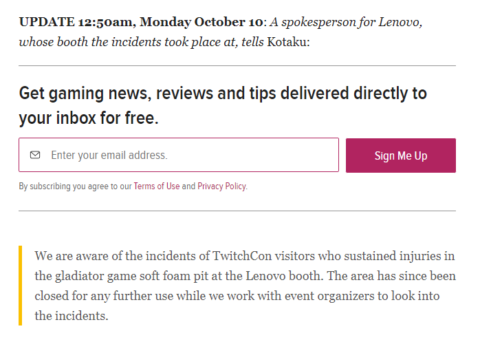 Okay, but what about the Lenovo Legion staff and representatives? Nearly the same logic applies. What instruction were they given? Did they know what to do in these situations? The only fact we have right now is the fact that we don’t know what communications were happening about this, or what factors ultimately played a role in the decision to keep the event open, and what led to its arguably-late shut down at 12pm PT, that Sunday. Neither Lenovo, nor Lenovo Legion, has not made any public comment about the matter from any social media, at this time. However, in an “email statement” from a Lenovo spokesperson received by NBC News, it was shared that Lenovo was aware of the incidents of injury received from the gladiator game soft foam pit at TwitchCon, and they closed the area “for any further use” while they “work with event organizers to look into incidents.”