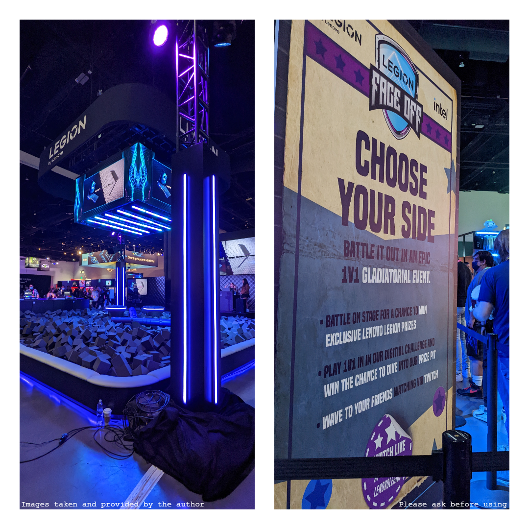 This event, which they called the “TeamLegion Face Off”, consisted of two participants, each standing on one of the two small platforms, in the middle of a shallow pit filled with foam squares. The participants are also each handed what I can only think to describe as “large foam battering-rams”, with the goal of knocking their opponent off their platform, and into the Pit. Attendees also had a chance to win a chance to “dive” into a “Prize Pit.” A quick search of the Lenovo Legion Twitch Channel shows that any VODs of the entire event have since been deleted, but the live-streamed event was clipped multiple times. However, there is still quite a bit of coverage of the event on the Lenovo Legion Twitter account, including both photos and videos, at this time of writing.