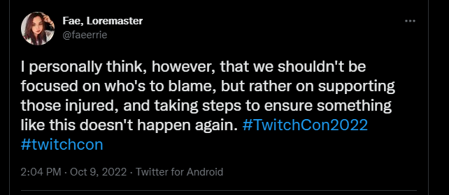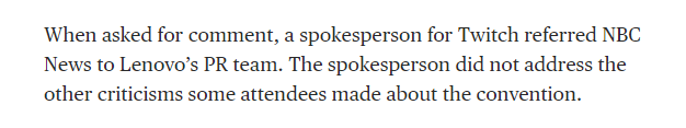Why didn’t Twitch just forcibly shut down the event, in the best interest of the safety of its attendees? Again, we don’t know. It’s hard to imagine this at their own convention, but did the TwitchCon management staff that could make that decision not know this was happening, at least at this severity, due to the sheer volume of events, panels, exhibits, special guests, and attendees to oversee, despite medics having to get involved more than once? Also, what would be the process of shutting it down, especially with a large sponsor such as Lenovo? When NBC News reached out to Twitch for comment, a spokesperson responded by referring them to Lenovo’s PR team, with no other apparent statement. I was unable to find any other comment from Twitch reported, nor any from direct Twitch sources. Kotaku reported that they reached out to Twitch for any comments, and that they would update their article on the situation if they hear back, with no update so far.