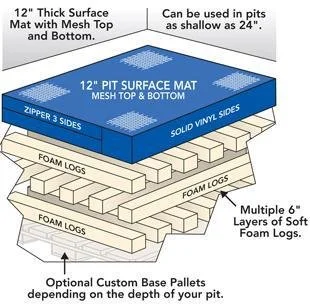 The other type described involves the foam cubes laying on top of a twelve-inch “super soft polyfoam” and mesh mat, which is on top of several layers of soft foam logs that are each six to twelve inches thick.