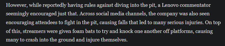 Part of the conversation surrounding this unfortunate situation is that Lenovo Legion did not turn off the live stream of the event after injuries (including Adriana’s very serious injury) were suffered, and, even worse in my opinion, they failed to shut down the event after these injuries occurred, not even temporarily, to inspect the Pit, and assess if safety measures for participation could be improved to an acceptable degree. Why was this allowed to continue after even the first reported injury?
